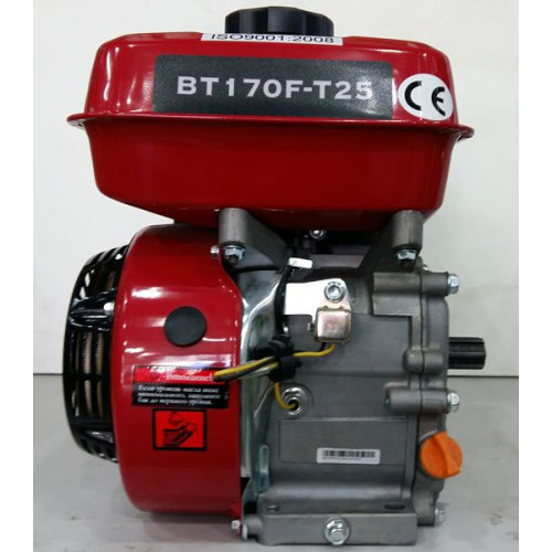 Двигатель бензиновый Weima BT170F-T/25, представляет собой, двигатель с шлицевым валом, диаметр которого 25 мм. Рабочая длина шлицов 30 мм. Длина вала до сальника 38 мм. Этот двигатель отличается увеличенной мощностью, если сравнивать его с предыдущими моделями двигателей, у которых максимальная мощность была 6.5 л.с. Данный двигатель, имеет мощность 7.0 л.с. Рабочий объем мотора, 210 см3. Система охлаждения двигателя также была изменена и усовершенствованна. Теперь воздушный фильтр, находится в масляной ванне, что в разы увеличивает качество очистки воздуха, при работах в пыльной и влажной среде. Одной из особенностей этого двигателя, можно считать, датчик низкого уровня масла. Благодаря этому, немало важному изменению, двигатель надежно защищен от не желательного запуска, при отсутствие смазки в картере двигателя, или при не достаточном его количестве. Картер двигателя имеет объем 0.6 л.