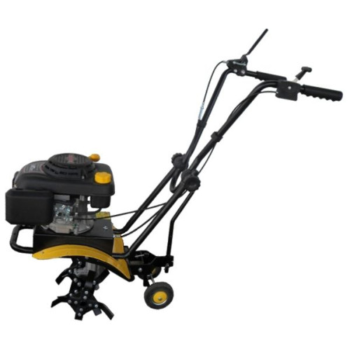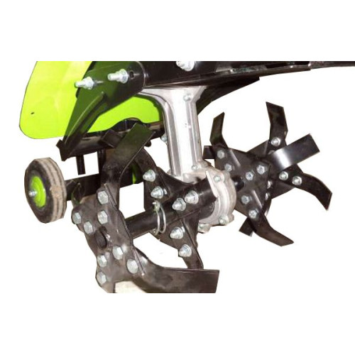 Культиватор имеет два транспортировочных колеса, а также регулируемые ручки управления, что позволяет настроить высоту под свой рост.