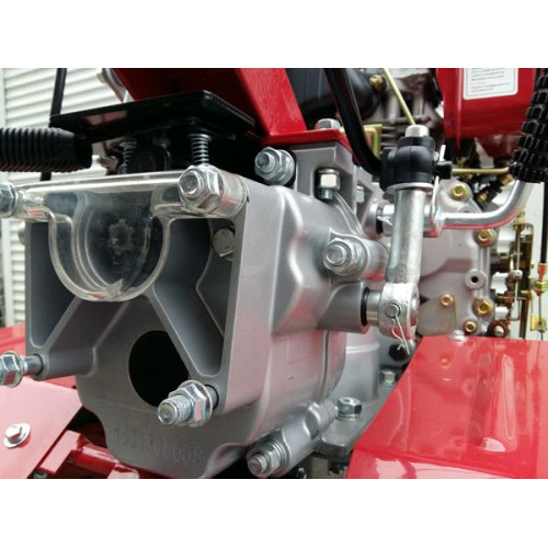 Привод в данной модели редукторный, что является положительным отличием, так как редукторные мотоблоки не требуют к себе особого внимания в отличие от ременных, в которых приходиться периодически подтягивать ремень. Сцепление многодисковое в масляной ванне. Трансмиссия шестеренчатый редуктор. Коробка передач 6 скоростей: 4 скорости вперед, 2 скорости назад. Расход топлива довольно экономичный и составляет всего 395 гр/кВт/ час. Топливный бак, имеет емкость 5.5 л. Учитывая малый расход топлива и наличие внушительного бака, работать с этим мотоблоком, можно длительный промежуток времени, без дополнительной заправки.