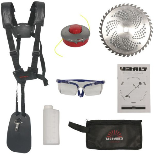Бензиновая коса от фирмы VITALS BK 5222a– это полу профессиональный инструмент для работы как на садовых участках, так и для заготовки сена. Мощная 2х-тактная бензокоса имеет мощность 2.2 кВт, или 2.9 л.с. Рабочий объем двигателя 52 см3. Эффективная система охлаждения, позволяет длительный промежуток времени работать без остановки. Также этому способствует топливный бачок, емкость которого 1.1 л. Который содержит в себе топливную смесь, 1 литр бензина А-92 и 25 грамм масла для 2х-тактных двигателей. Обратите внимание на топливном бачке, имеется защита, которая сохраняет бак в целостности при запуске двигателя.