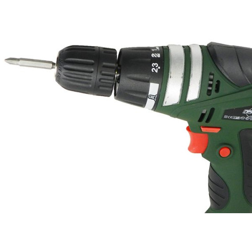 Быстрозажимной патрон, именно в этой модели, отличается высоким качеством исполнения, так как выполнен из высококачественной стали. Также отличительной чертой, может считаться, диапазон зажимного патрона, который может работать с сверлом, диаметр которого, от 0.4 и до 10 мм. В основание патрона, находится, кольцо контроля степени затяжки. Благодаря чему, вы сможете максимально точно подобрать, нужный для вас режим работы. Регулировка, происходит, от 1 и до 23. Также имеется режим сверления, в котором, вы сможете сверлить отверстия, довольно большего диаметра.