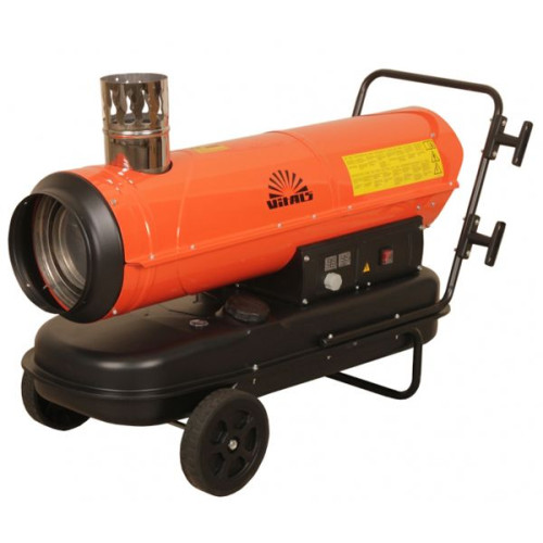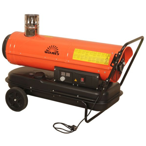 Двигатель вентилятора, работает от электросети 220В, Емкость топливного бака 56 л. Расход топлива 2.5 л/час. При таком не значительном расходе, обогреватель не прямого действия, может работать длительный промежуток времени. Время работы на прямую связано, с тем как утеплено помещение, если помещение качественно утеплено и имеет минимальную, тепло потерю, то данная тепловая пушка, с помощью терморегулятора, которым она оснащена, будет поддерживать температуру, в помещение которое вы обогреваете. Вот вам и простая математика, чем лучше утеплено помещение, тем скорей термостат, отключит обогрев, а значит вы экономите, топливо. Еще одной особенностью, является контролер, пламени – это значит, в случае затухания огня в горелке, подача топлива, мгновенно прекращается. Регулируемая горелка, гарантирует, полное сгорание дизельного топлива. Также имеется защита, от не желательного перегрева, в таком случае обогреватель, отключается на некоторое время, пока температура не стабилизируется. Мобильность, всегда считалась одной из самых важных характеристик, любой техники. По этой причине, производитель, предусмотрительно обеспечил этот нагревательный агрегат, колесами и удобной ручкой. Теперь в случае необходимости, можно переместить обогреватель с одного места на другое, подсоединить отвод газа и ваш дизельный обогреватель VITALS DHC-301, готов к работе.