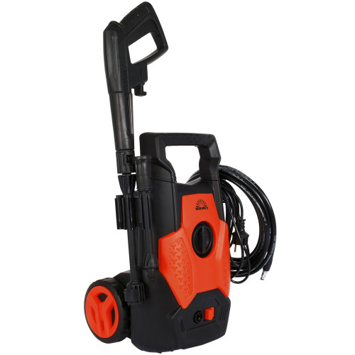 Весь рабочий механизм электродвигатель и блок, размещены в прочном пластмассовом корпусе. На котором имеется транспортировочная ручка, а также колеса для перекатывания вашей минимойки с места на место. Крепежи под пистолет, провод электрозапитки. На изделие вы увидите переключатель режимов работы.