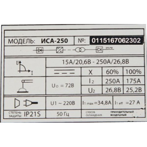 ОсобливостіГорячий старт,автоматический форсаж дуги,функция антизалипание электрода,термическая защита аппарата,защита от повышенного пониженного напряженияКласифікаціяИнверторный сварочный аппарат Вихідна напруга26.8 ВДіаметр використовуваного електрода.мм1.6-5.0 ммДіапазон регулювання зварювального струму.А20-250 ВВсі характеристики