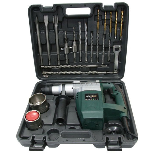 Кейс,набор буров,зубило,пика,долото желобковое дополнительная рукоятка,коронки по бетону,удлинитель,буры по бетону с покрытием нитрид титана,смазка,пыльник,спец ключ,очки,щетки угольные